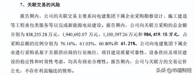 而电建新能母公司中国电建较为迥殊,其并不属于传统电力集团,中国电建主营工程承包与勘测筹谋,虽为旗下子公司电建新能开拓配置风电、光伏电站提供了自然便利,却也显赫加大了其 IPO 审核中关联交游的审查难度。敷陈期内,电建新能关联采购占总采购额比例区分高达 76.14%、61.03%、60.80% 和 61.21%。