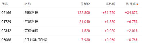 限度收盘,剑桥科技(06166.HK)涨34.87%,汇注科技(01729.HK)涨6.75%,京信通讯(02342.HK)涨2.01%。