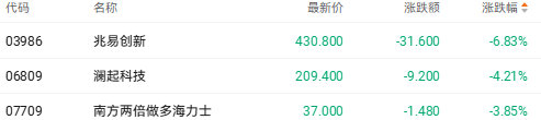 限度收盘,兆易创新(03986.HK)跌6.83%,澜起科技(06809.HK)跌4.21%。