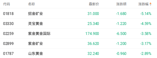 限度收盘,招金矿业(01818.HK)跌5.14%,灵宝黄金(03330.HK)跌4.59%,紫金黄金国际(02259.HK)跌3.58%。