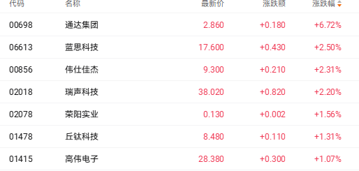限度收盘,蓝想科技(06613.HK)涨2.50%,瑞声科技(02018.HK)涨2.20%,丘钛科技(01472.HK)涨1.31%。